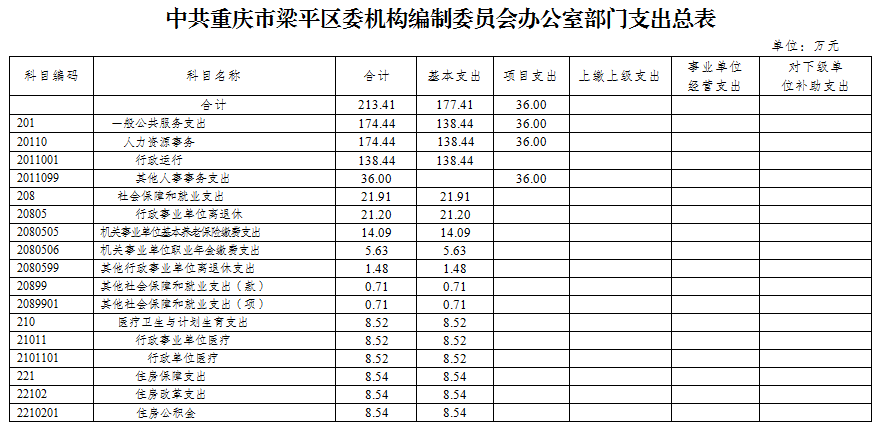 2019年一般公共預算財政撥款收入213.41萬元,一般公共預算財政撥款支出213.41萬元,比2018年增加26.40萬元。其中:基本支出177.41萬元,比2018年增加28.40萬元,主要原因是人員經費增加等,主要用于保障在職人員工資福利及社會保險繳費,退休人員補助等,保障部門正常運轉的各項商品服務支出;項目支出36.00萬元,比2018年減少2.00萬元,主要原因是嚴格控制項目經費支出等,主要用于行政審批制度改革、黨政機關機構改革、黨政機關網站開辦審核及管理、政務和公益機構域名注冊等重點工作。