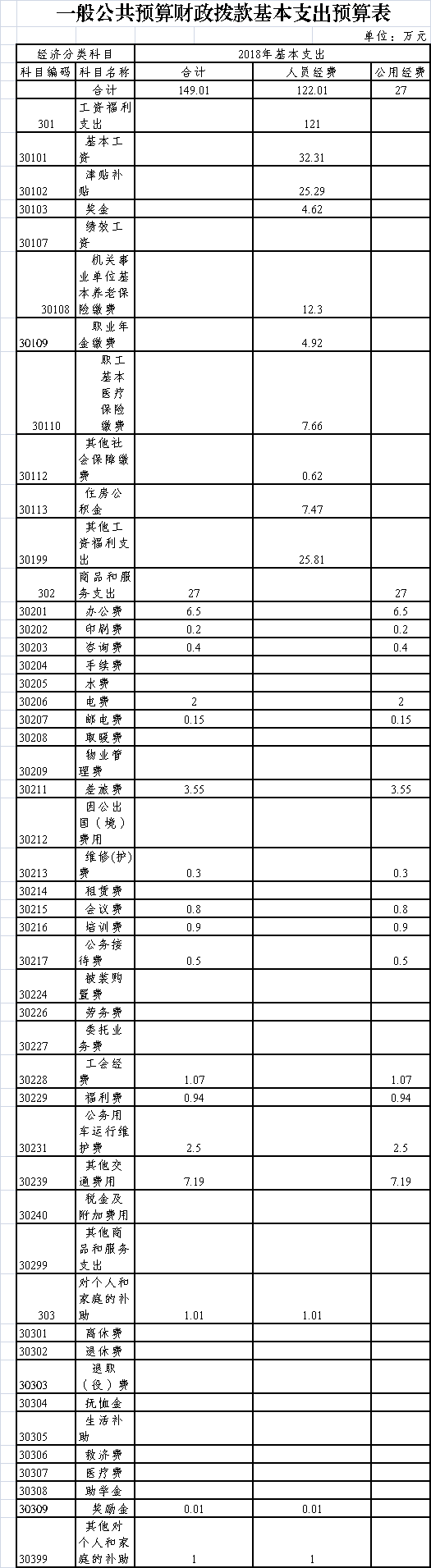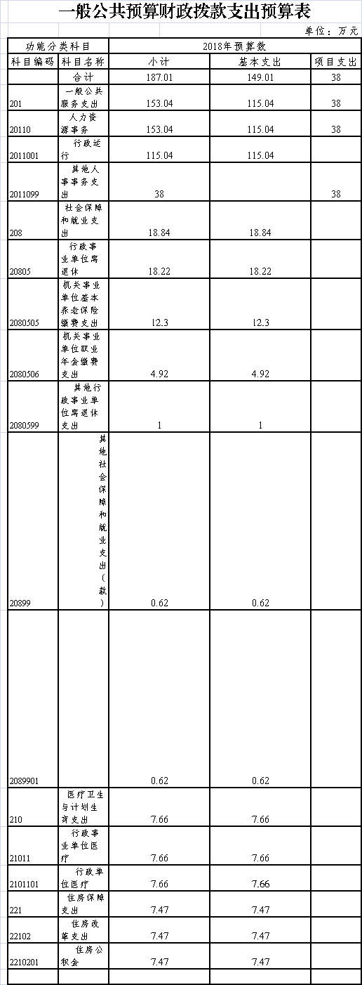 2018年一般公共預(yù)算財政撥款收入187.01萬元,一般公共預(yù)算財政撥款支出187.01萬元,比2017年增加42.70萬元。其中:基本支出149.01萬元,比2017年增加42.20萬元,主要原因是人員經(jīng)費增加等,主要用于保障在職人員工資福利及社會保險繳費,離退休人員離退休費及生活補助,保障部門正常運轉(zhuǎn)的各項商品服務(wù)支出;項目支出38.00萬元,比2017年增加0.50萬元,主要原因是項目實施運行成本增加等,主要用于行政審批制度改革、鄉(xiāng)鎮(zhèn)機構(gòu)改革、黨政機關(guān)網(wǎng)站開辦審核及管理、政務(wù)和公益機構(gòu)域名注冊等重點工作。