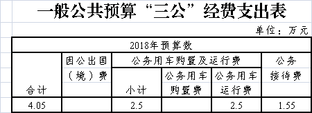 2018年“三公”經(jīng)費預(yù)算4.05萬元,比2017年減少0.15萬元。其中:因公出國(境)費用0萬元,比2017年減少(或增加) 0萬元;公務(wù)接待費1.55萬元,比2017年減少0.41萬元;公務(wù)用車運行維護費2.50萬元,比2017年增加0.26萬元;公務(wù)用車購置費0萬元,比2017年減少(或增加)0 萬元;主要原因是嚴格管理,控制支出。