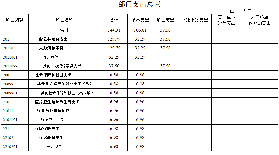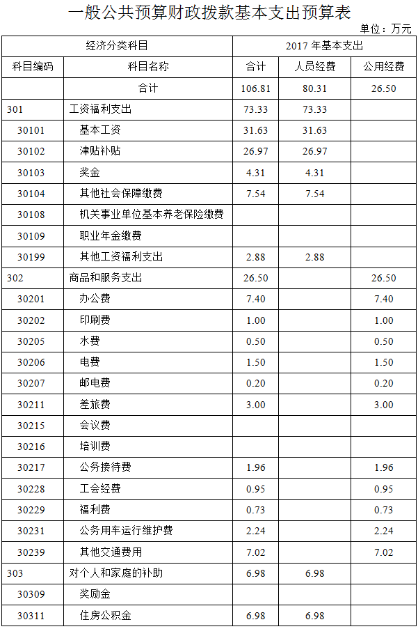 2017年一般公共預算財政撥款收入144.31萬元,一般公共預算財政撥款支出144.31萬元,比2016年增加27.76萬元。其中:基本支出106.81萬元,比2016年增加20.76萬元,主要原因是實施工資制度改革后,人員經費增加,同時公用經費調標等,主要用于保障在職人員工資福利及社會保險繳費,離退休人員離退休費及生活補助,保障部門正常運轉的各項商品服務支出;項目支出37.50萬元,比2016年增加7.0萬元,主要原因是承擔行政職能事業單位改革試點工作,主要用于行政審批制度改革、事業單位改革、黨政機關網站開辦審核及管理、政務和公益機構域名注冊等重點工作。