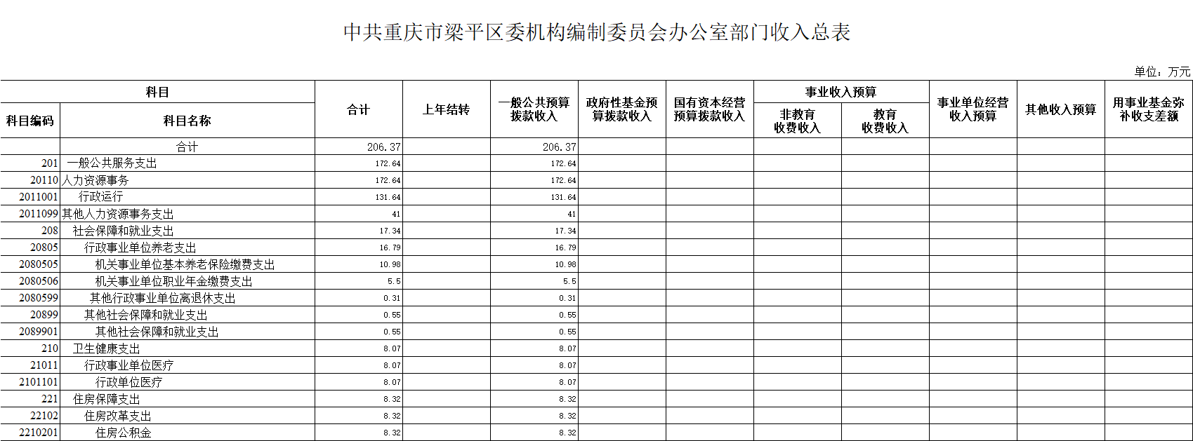 (一)收入預算:2020年年初預算數206.37萬元,其中:一般公共預算撥款206.37萬元,政府性基金預算撥款0萬元,國有資本經營預算收入0萬元,事業收入0萬元,事業單位經營收入0萬元,其他收入0萬元。收入較去年減少7.04萬元,主要是人員減少。