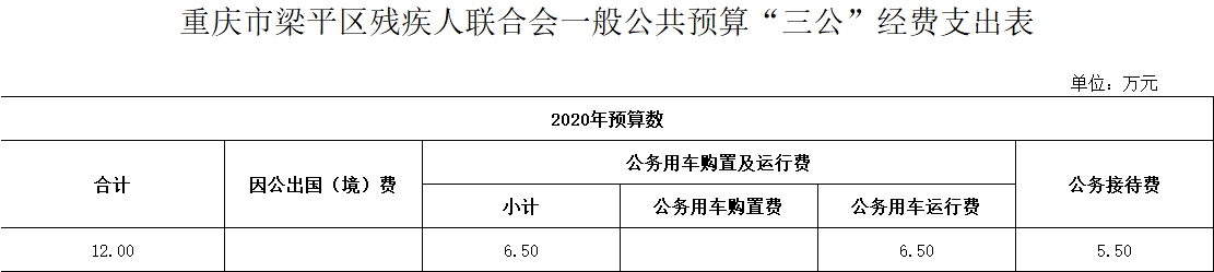 2020年“三公”經費預算為12萬元,對比2019年減少1.43萬元。其中:因公出國(境)費用0萬元,比2019年減少0萬元,主要原因是未發生因公出國(境)費用;公務接待費5.5萬元,比2019年減少0.35萬元,主要原因是厲行勤儉節約,減少公務接待,從而造成公務接待費用減少;公務用車運行維護費6.5萬元,對比2019年減少1.08萬元,主要原因是嚴格控制公務車出行,單位職工到梁平區以外的區縣及主城培訓、開會盡量乘坐高鐵。公務用車購置費0萬元,比2019年減少0萬元。
