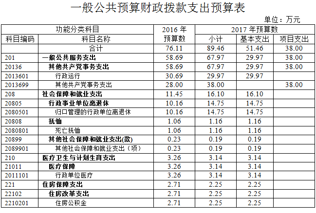 ?2017年一般公共預算財政撥款收入89.46萬元,一般公共預算財政撥款支出89.46萬元,比2016年增加13.35萬元。其中:基本支出51.46萬元,比2016年增加3.35萬元,主要原因是工資調標等,主要用于保障在職人員工資福利及社會保險繳費,離退休人員離退休費及生活補助,保障部門正常運轉的各項商品服務支出;項目支出38萬元,比2016年增加10萬元,主要原因是需編撰多本黨史著作等,主要用于黨史書籍編研等重點工作。