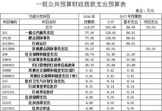 2017年一般公共預(yù)算財(cái)政撥款收入162.45萬元,一般公共預(yù)算財(cái)政撥款支出162.45萬元,比2016年增加47.48萬元。其中:基本支出99.45萬元,比2016年增加9.48萬元,主要原因是調(diào)資等,主要用于保障在職人員工資福利及社會(huì)保險(xiǎn)繳費(fèi),離退休人員離退休費(fèi)及生活補(bǔ)助,保障部門正常運(yùn)轉(zhuǎn)的各項(xiàng)商品服務(wù)支出;項(xiàng)目支出63萬元,比2016年增加38萬元,主要原因是群團(tuán)改革等,主要用于開展婦女兒童等重點(diǎn)工作。