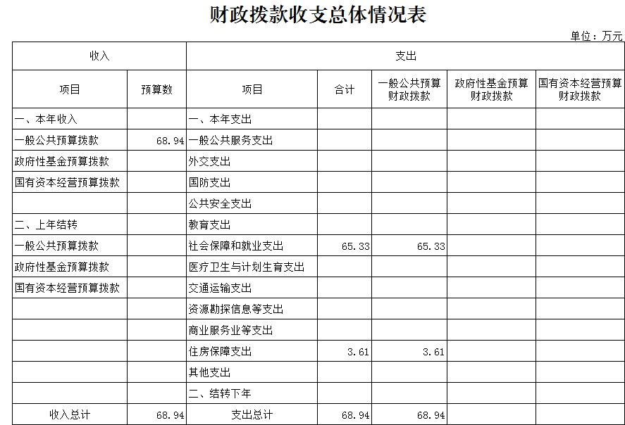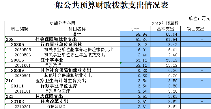 2018年一般公共預(yù)算財(cái)政撥款收入68.94萬(wàn)元,一般公共預(yù)算財(cái)政撥款支出68.94萬(wàn)元,比2017年增加21.54萬(wàn)元。其中:基本支出68.94萬(wàn)元,比2017年增加21.54萬(wàn)元,主要原因是職工工資、津補(bǔ)貼等較2017年調(diào)高,主要用于保障在職人員工資福利及社會(huì)保險(xiǎn)繳費(fèi),保障部門(mén)正常運(yùn)轉(zhuǎn)的各項(xiàng)商品服務(wù)支出。