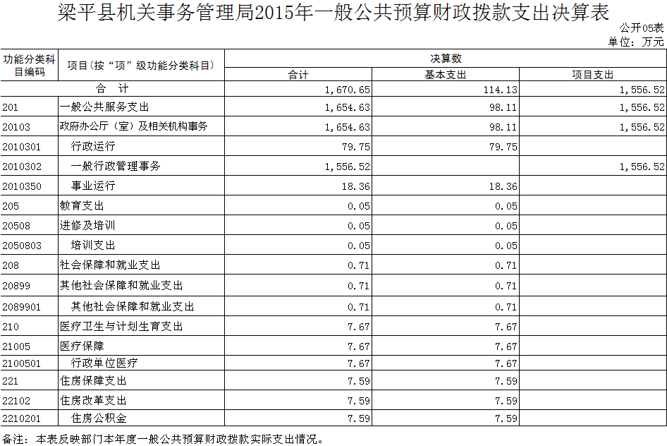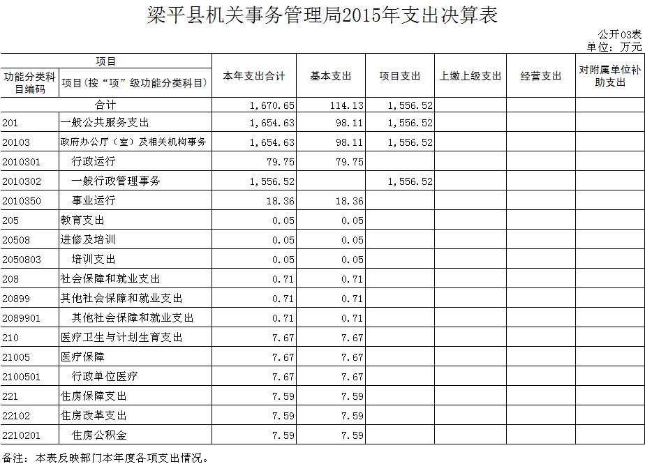 (二)2015年部門決算本年支出數為1670.65萬元,其中:一般公共服務決算支出1654.63萬元,教育支出0.05萬元,社會保障和就業決算支出0.71萬元,醫療衛生與計劃生育決算支出7.67萬元,住房保障決算支出7.59萬元。比上年決算數增加1061.50萬元,主要原因項目支出增大。比年初預算數增加951.10萬元,主要原因:人員經費、業務項目經費支出的增大。