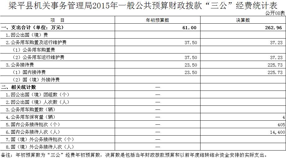 2015年梁平縣機關事務管理局“三公”經費決算數為262.96萬元,其中:公務接待費決算數225.73萬元,主要原因是全縣經濟社會發展勢頭強勁,外在知名度和影響力明顯提升,來我縣視察調研、檢查指導工作的領導、參觀考察的黨政代表團和尋求發展的客商紛至沓來。政務接待的批次及舉辦大型會議及活動的場次增加,2015年實際發生因公接待405批次,14400人次,人均接待費用0.01萬元;公務用車運行維護費決算數37.23萬元,比上年決算數減少0.66萬元,比年初預算數減少0.27萬元,主要原因是嚴格遵守八項規定、厲行節約,公務用車次數減少及運行維護費降低。2015年公務用車保有量為4輛,車均運行維護費用9.3萬元。