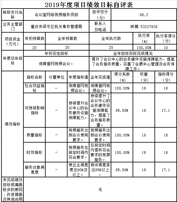 2019年度會(huì)議室網(wǎng)絡(luò)視頻服務(wù)項(xiàng)目績(jī)效自評(píng)綜述:根據(jù)年初設(shè)定的績(jī)效目標(biāo),項(xiàng)目總體完成保障普網(wǎng)視頻會(huì)議。項(xiàng)目全年預(yù)算數(shù)為20萬元,執(zhí)行數(shù)為20萬元,完成預(yù)算的100.0%。主要產(chǎn)出和效果:一是提升了會(huì)議中心的會(huì)務(wù)硬件設(shè)施保障能力,二是提高了會(huì)務(wù)服務(wù)質(zhì)量,三是完善了會(huì)展中心管理及會(huì)務(wù)保障工作。