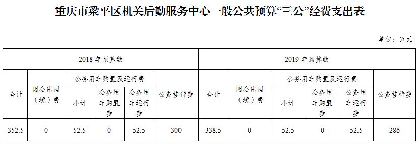 2019年“三公”經費預算338.50萬元,比2018年減少14萬元。其中:因公出國(境)費用0萬元,比2018年減少0萬元,主要原因是本單位無因公出國(境)安排;公務接待費286萬元,比2018年減少14萬元,主要原因是我單位嚴格落實厲行節約的各項規定,繼續從嚴從緊控制經費支出;公務用車運行維護費52.5萬元,比2018年減少0萬元,主要原因是本單位2019年無特殊額外支出;公務用車購置費0萬元,比2018年減少0萬元,主要原因是我單位無公務用車購置費。