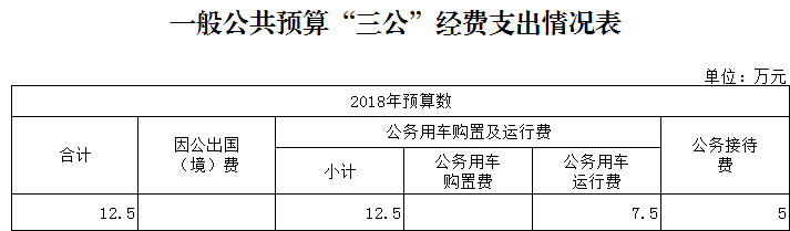 (五)“三公”經費:指用一般公共預算財政撥款安排的因公出國(境)費、公務用車購置及運行維護費、公務接待費。其中,因公出國(境)費反映單位公務出國(境)的國際旅費、國外城市間交通費、住宿費、伙食費、培訓費、公雜費等支出;公務用車購置費反映單位公務用車購置支出(含車輛購置稅);公務用車運行維護費反映單位按規定保留的公務用車燃料費、維修費、過路過橋費、保險費、安全獎勵費用等支出;公務接待費反映單位按規定開支的各類公務接待(含外賓接待)支出。