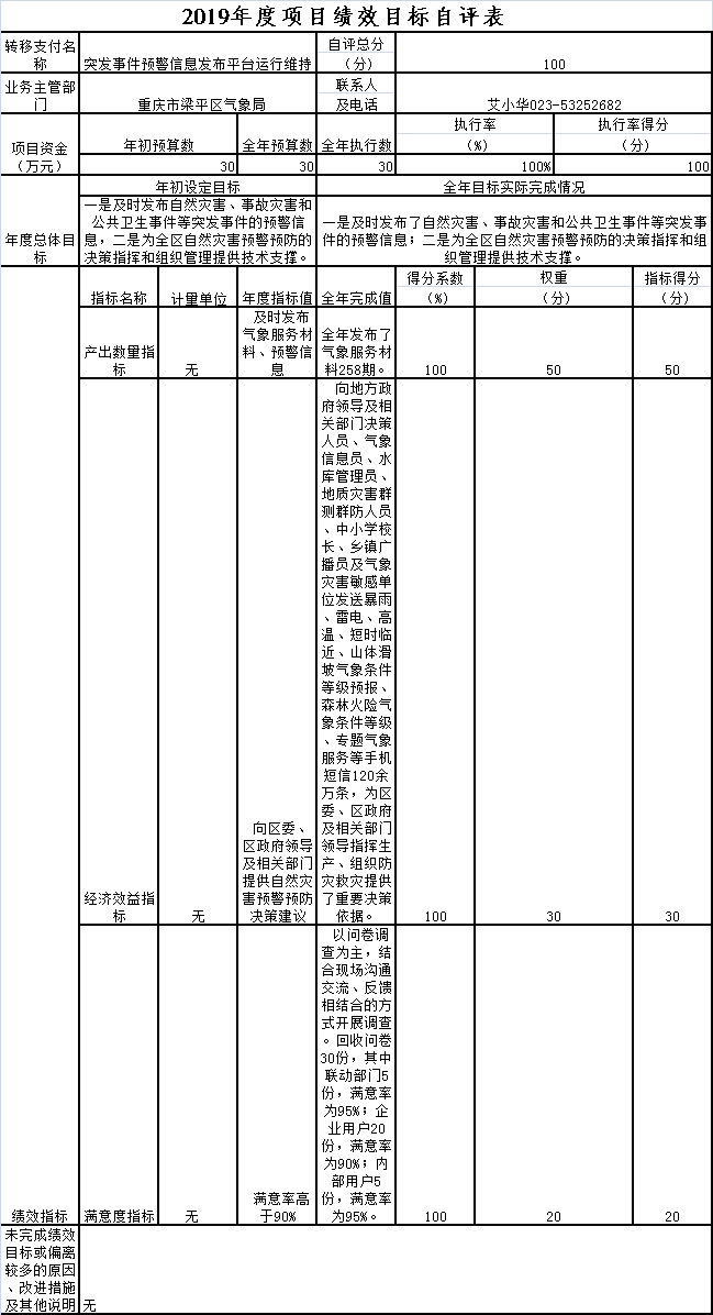 突發事件預警信息發布平臺運行維持項目績效目標自評綜述:根據年初設定的績效目標,項目總體完成情況良好。項目全年預算數為30萬元,執行數為30萬元,完成預算的100%。主要產出和效果:一是及時發布自然災害、事故災害和公共衛生事件等突發事件的預警信息,二是為全區自然災害預警預防的決策指揮和組織管理提供技術支撐,三是為應急指揮平臺提供基礎數據共享、系統研判組織、災情收集匯總的基礎功能。發現的問題及原因,無。下一步改進措施,無。