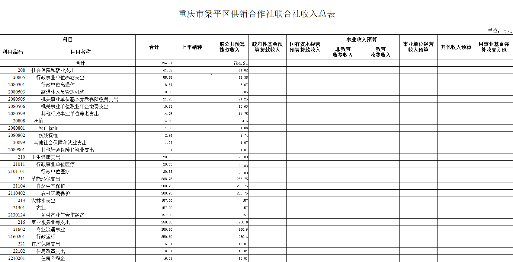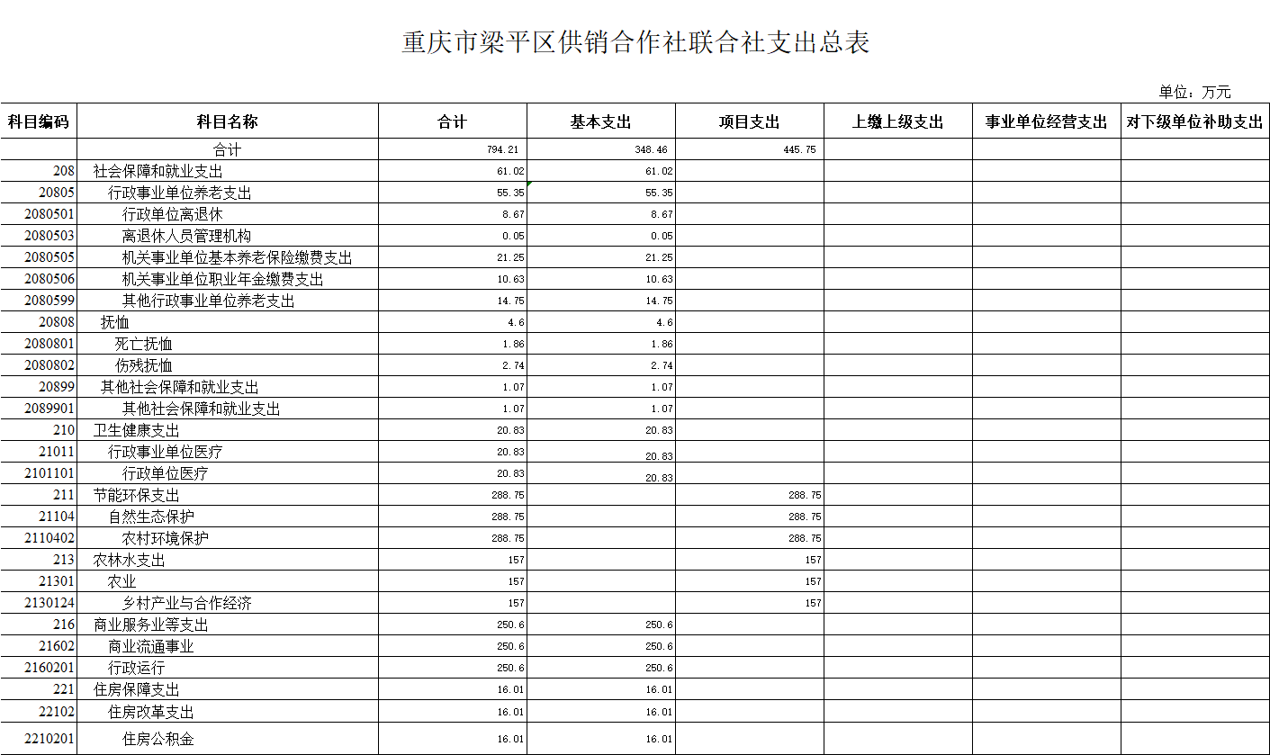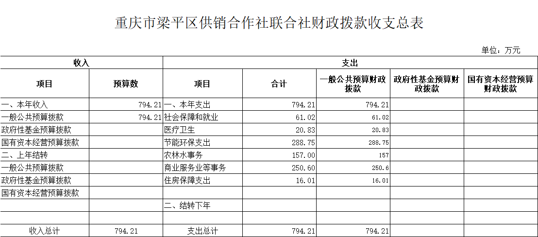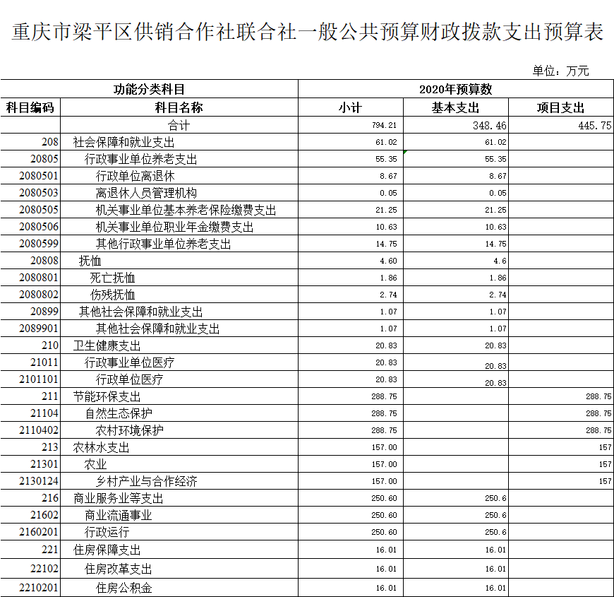 2020年一般公共預算財政撥款收入794.21萬元,一般公共預算財政撥款支出794.21萬元,比2019年增加 103.97萬元。其中:基本支出348.46萬元,比2019年減少31.78萬元,主要原因一是區(qū)社一名職工退休,二是公用經(jīng)費標準進一步調(diào)低。主要用于保障梁平區(qū)供銷合作社聯(lián)合社在職人員工資福利及社會保險繳費,離休人員離休費,退休人員補助等,保障部門正常運轉(zhuǎn)的各項商品服務支出;項目支出445.75萬元,比2019年增加103.97萬元,主要原因:根據(jù)區(qū)政府統(tǒng)安排的“兩社兩化”發(fā)展專項資金,統(tǒng)一調(diào)整為100萬元,比2019年增加5萬元,增加了5%。根據(jù)市供銷社安排,增加農(nóng)村環(huán)境保護項目資金288.75萬元。