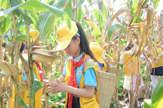 學生志愿者和鄉村兒童一起體驗掰玉米活動。(劉文靜 攝)