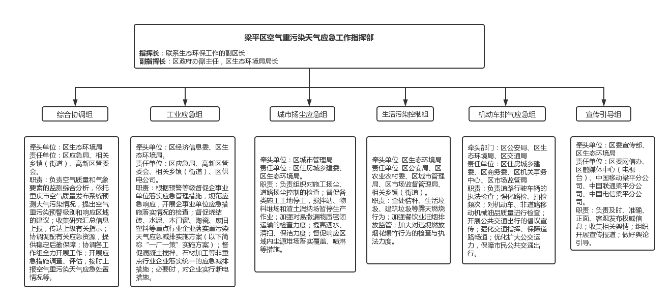 區指揮部下設綜合協調組、工業應急組、城市揚塵應急組、生活污染控制組、機動車排氣應急組和宣傳引導組,組織開展應急響應工作。